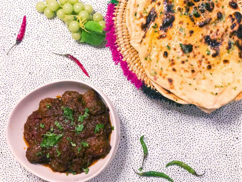 Get all the food prep ready; follow the three simple stages; and before you know it, you’ll end up with beautifully cooked meat that just falls off the bone, which can be served with Basmati rice, plain naan and salad. I made a simple salad using fresh green and red tomatoes from our allotment, red onion and fresh coriander, all thinly chopped and mixed together.