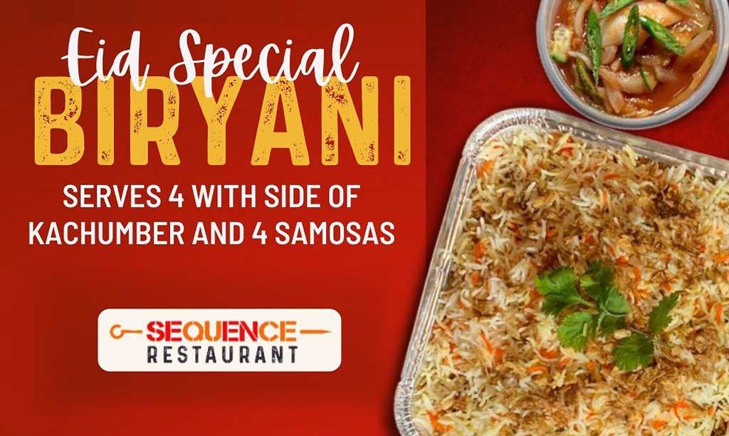 If you fancy East African fusion food, then Sequence in London Watford are serving an Eid Special Biryani that serves four, with sides of kachumber and four samosas for £32.99. Collection only on Monday 2nd and Tuesday 3rd May/