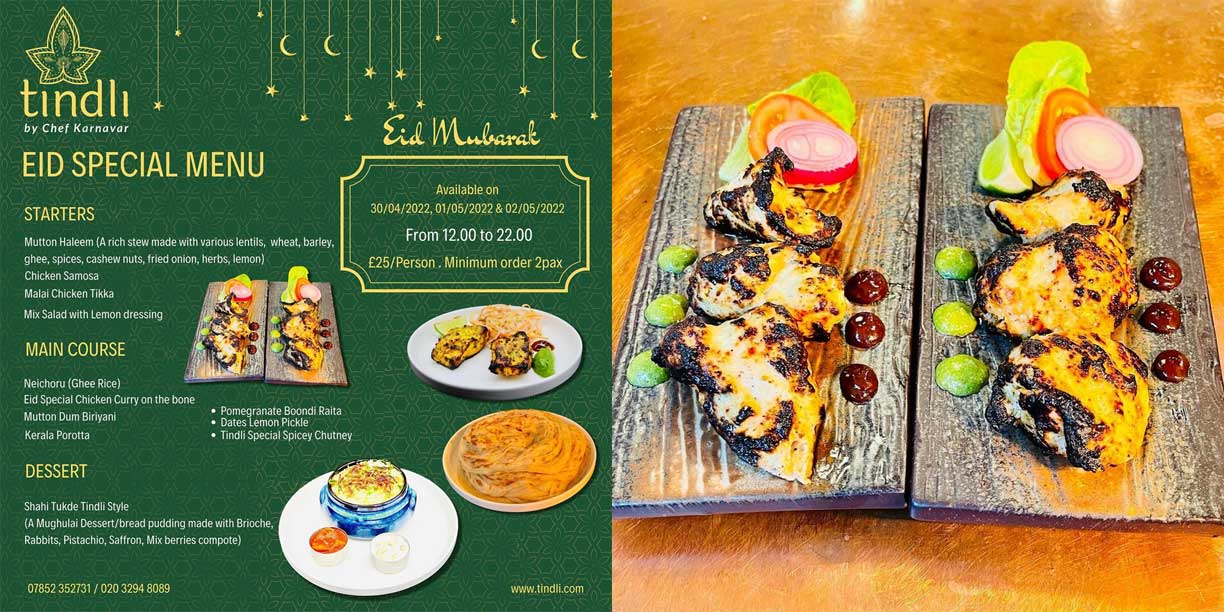 Chef Karnavar brings his 28 years experience at 5 star hotels like Marriott, Renaissance, Fairmont, Savoy, Mandarin Oriental & Claridges London to bear on Indian restaurant Tindli‘s £25pp (minimum 2 person) Eid menu, which is available for today, tomorrow 1st and Monday 2nd May via booking.