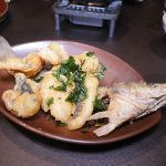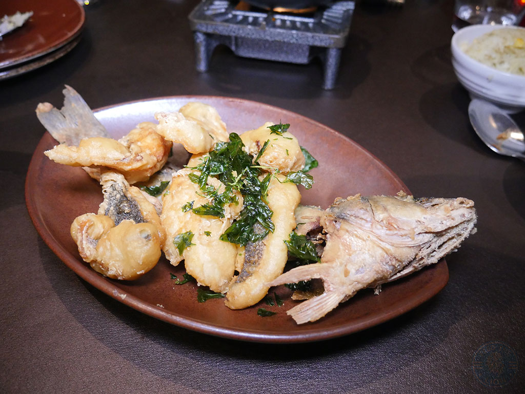 With the fish having been conveniently filleted and apportioned into bite-size chunks, both these and the remains of the head and skeletal frame were battered, before being deep fried.