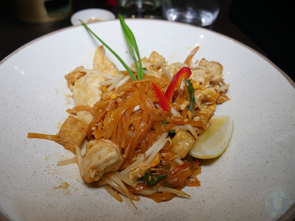 Pad Thai (Chicken) – Rice noodles, egg, tofu, bean sprouts, Chinese chives, sweet turnip with crushed peanuts, £15.50