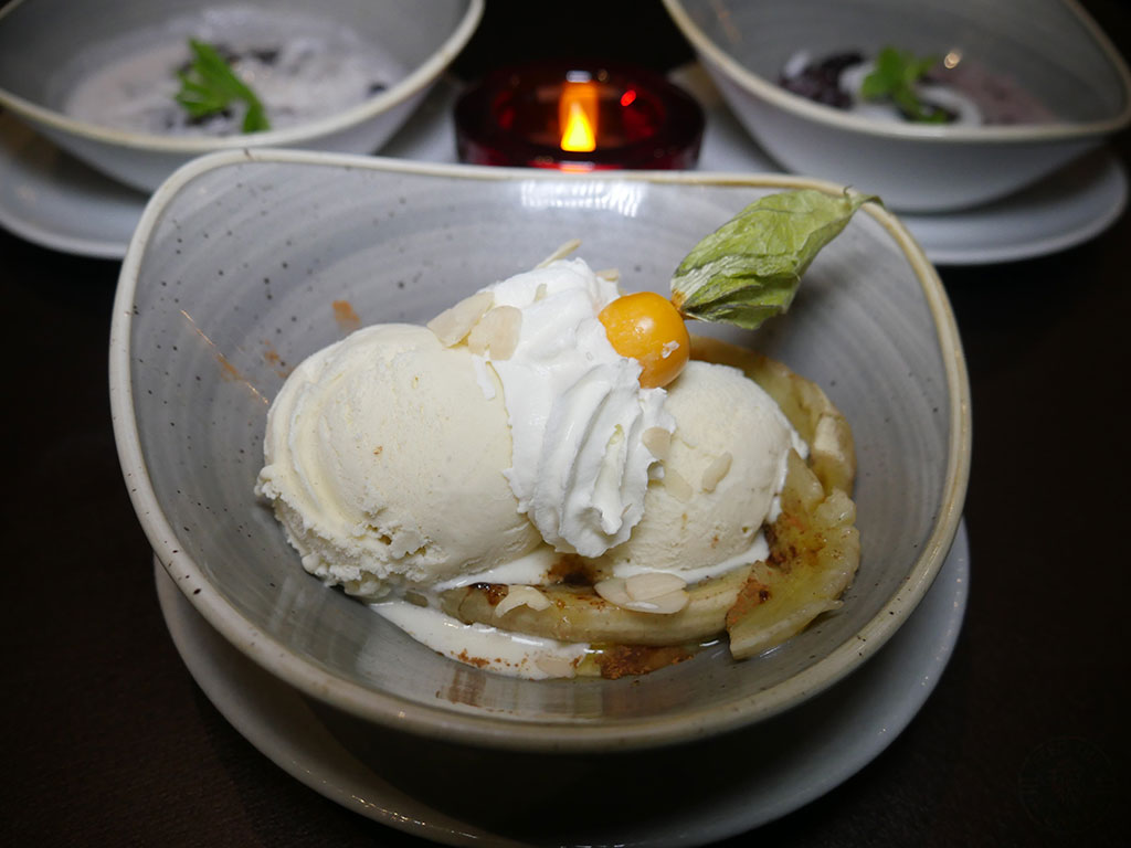Looking past the presentation, the combination of the caramelised green banana, topped with toasted almonds, with vanilla ice cream, made this dessert far better than expected.
