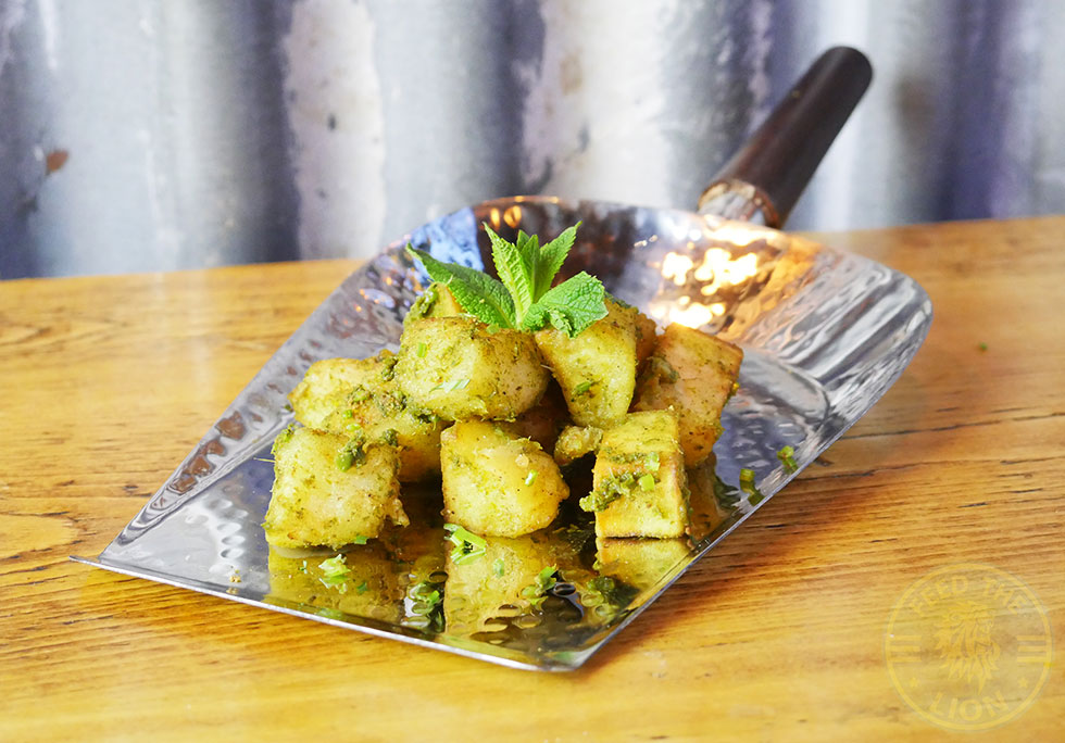 Aloo Kachalu Chaat £8.95 – Smartly presented on a dainty shovel is the Aloo Kachaloo Chat. A combination of boiled potatoes and sweet potatoes all tossed together in a tangy chaat masala and homemade finger-licking mint sauce. An irresistible chaat!