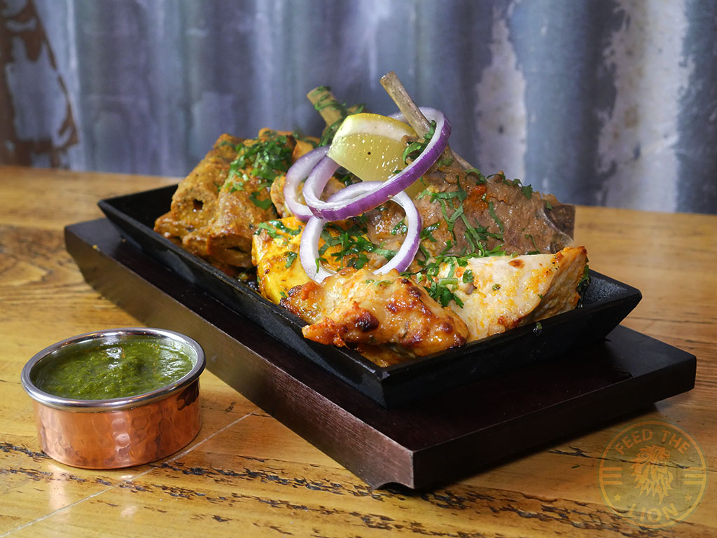 Mix Grill – Half tandoori chicken, 2 seekh kebabs, 2 malai tikka, 2 paneer tikka, 2 chops cooked in tandoor and then finished on angeethi. Served on sizzling plate.