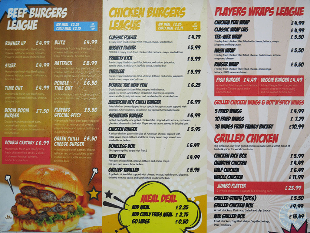 In any case, there’s three ‘leagues’ to consider: a ‘Beef Burgers League’ with 10 options, a ‘Chicken Burger League’ with 11, and a ‘Players Wraps League’ offering five choices, in addition to a fish and veggie burger each.