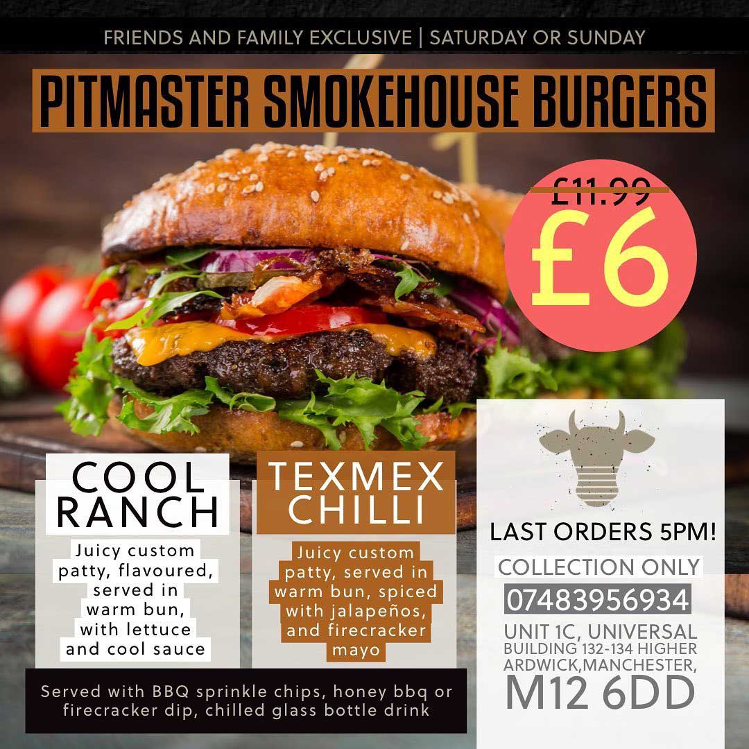 Pitmaster on Wilmslow Road in Manchester are offering two of their Smokehouse Burgers as a meal with chips, BBQ Honey Dip or Firecaker Mayonnaise Dip, and a glass of bottled drink of your choice for half price at £6. The burgers are: 1) Cool Ranch with lettuce and cool sauce, 2) Tex Mix Chilli spiced with jalapen?os, and firecracker mayo.
