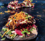 Cauliflower Pakora – drizzled with pear & tamarind chutney, pickles and herbs – sitting pretty on a black charcoal naan