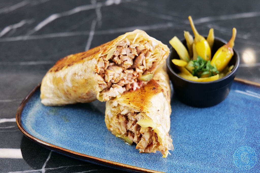 Chicken Shawarma – Roasted thin slice of marinated chicken, garlic sauce, pickles & tomatoes, £6.50