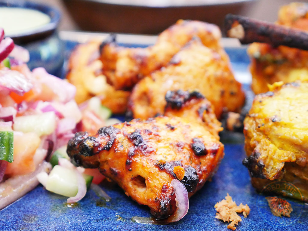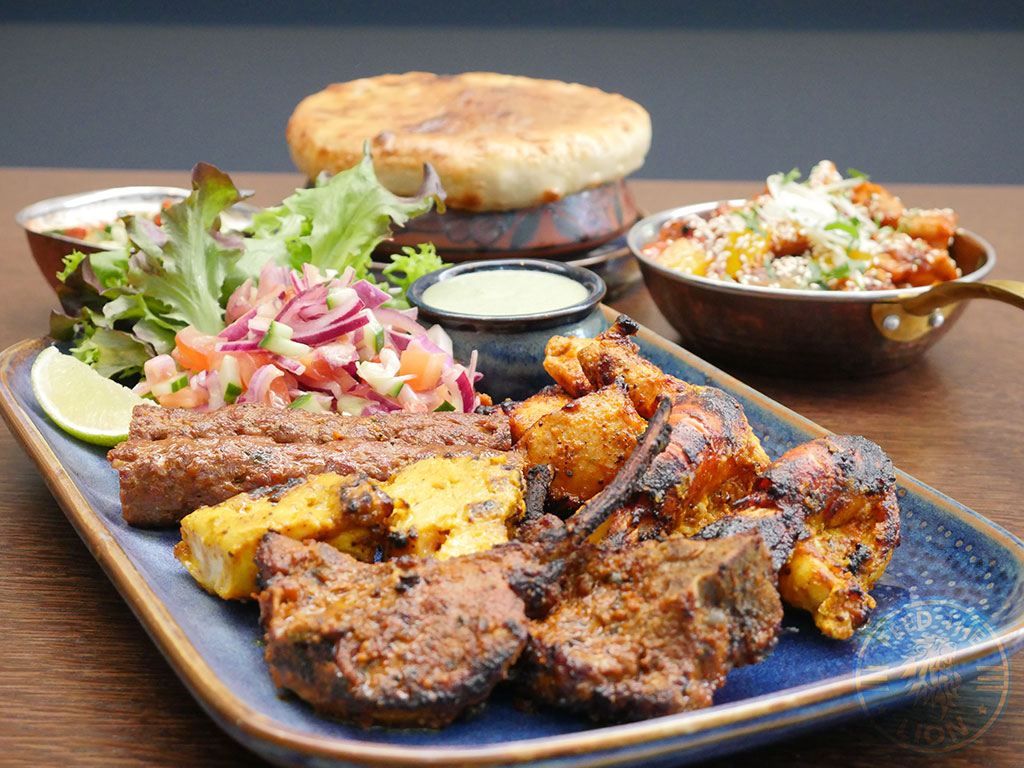 The Royal Platter – Chicken tikka, seekh kabab, lamb chops, fish, prawns served with dips & salad, £25.00