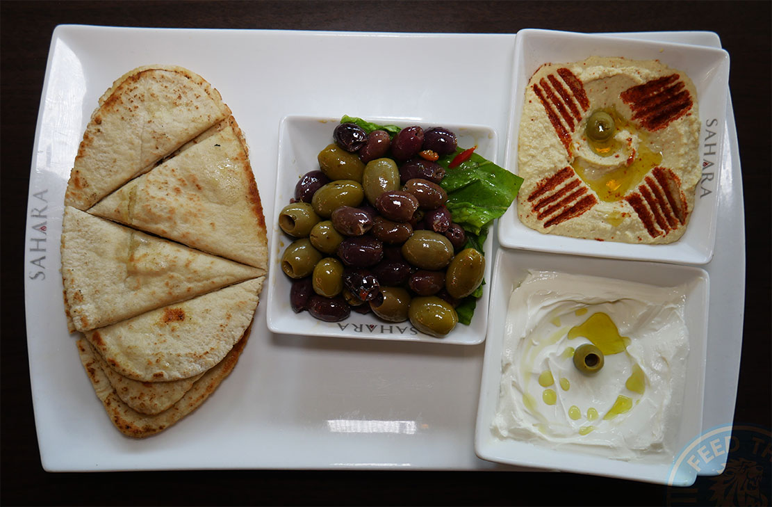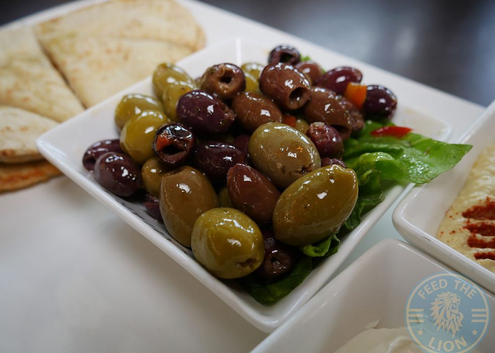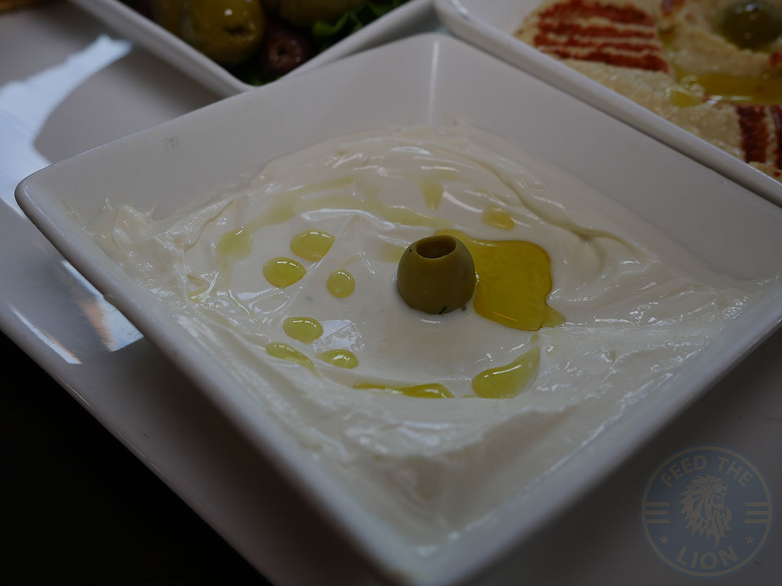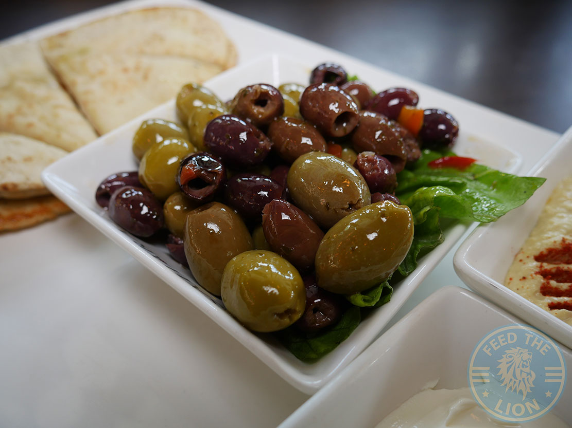 A straightforward Mixed Dip Platter comprising of hummus, mixed olives, a Tzatziki or thick greek style yoghurt, and a portion of pitta bread.