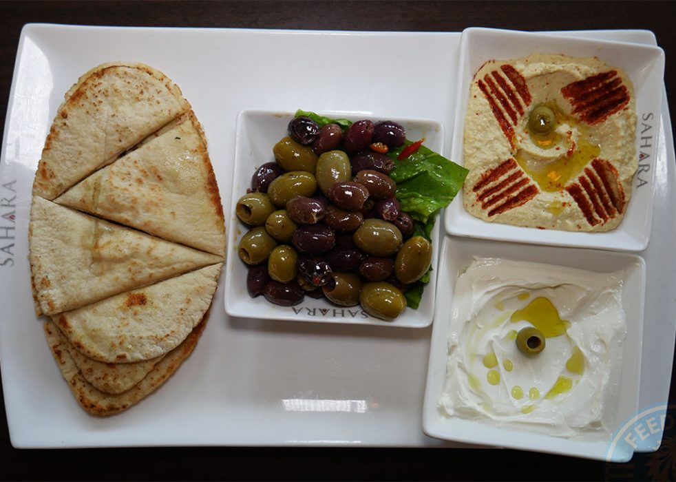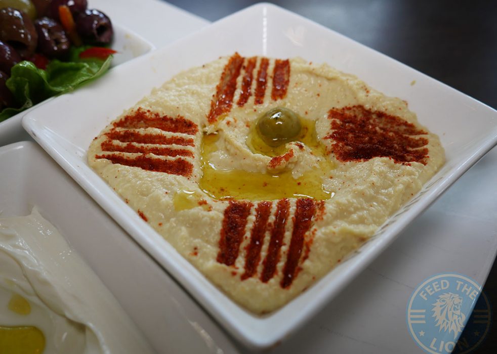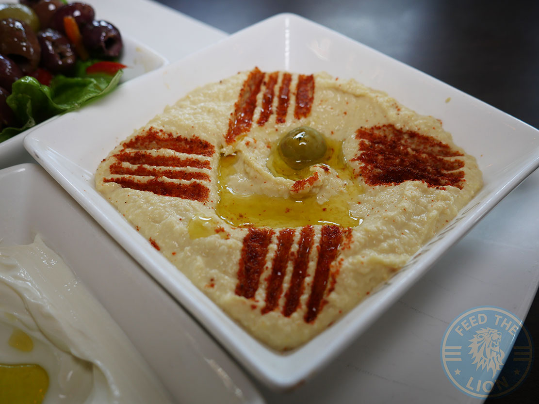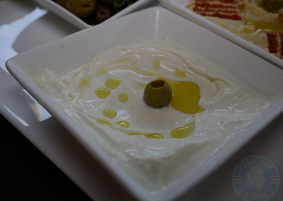 A straightforward Mixed Dip Platter comprising of hummus, mixed olives, a Tzatziki or thick greek style yoghurt, and a portion of pitta bread.