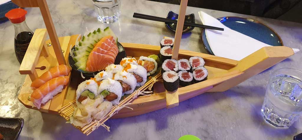 There was also a sushi platter with a variety of salmon and tuna presented in an elaborate wooden boat which we found to be somewhat novel.
