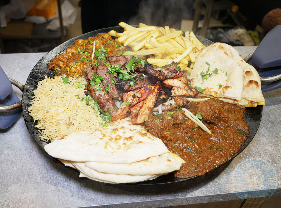 Now that’s a Tavah! Signature large Platter for £44.00 with chicken tikka, wings & karahi; lamb tikka, chops & karahi; seekh kebabs; chips; rice; naan & salad