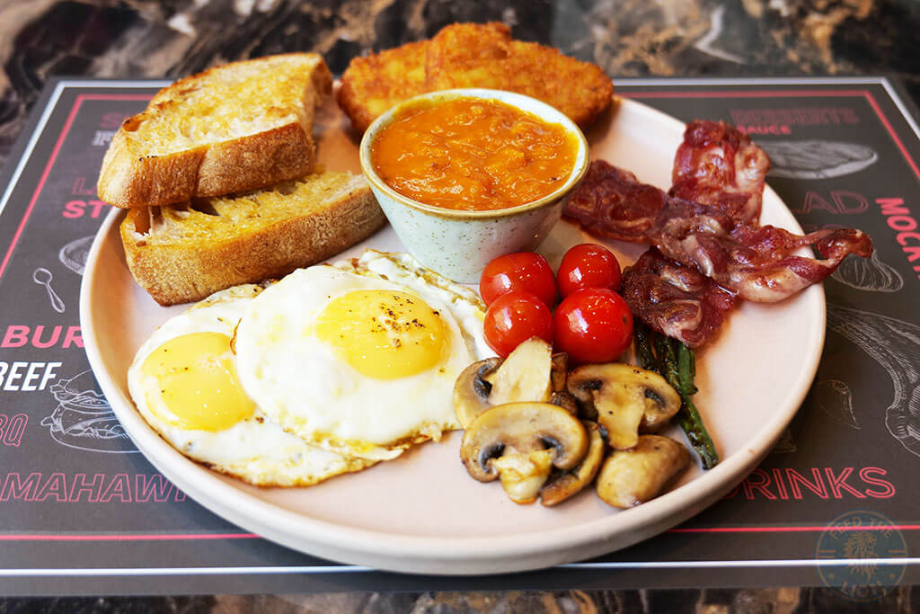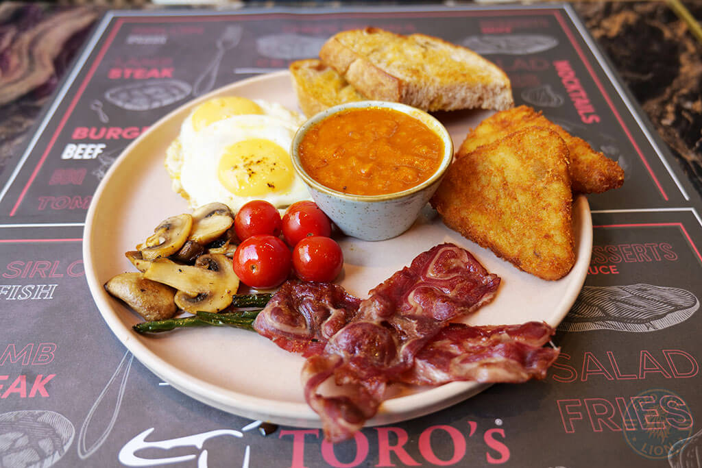 It’s only appropriate, therefore, that we begin with The Big Toro’s Breakfast, with free-range fried eggs, quality strips of crispy turkey bacon, grilled tomatoes, mushrooms, hash brown, and crunchy sour dough slices of bread.